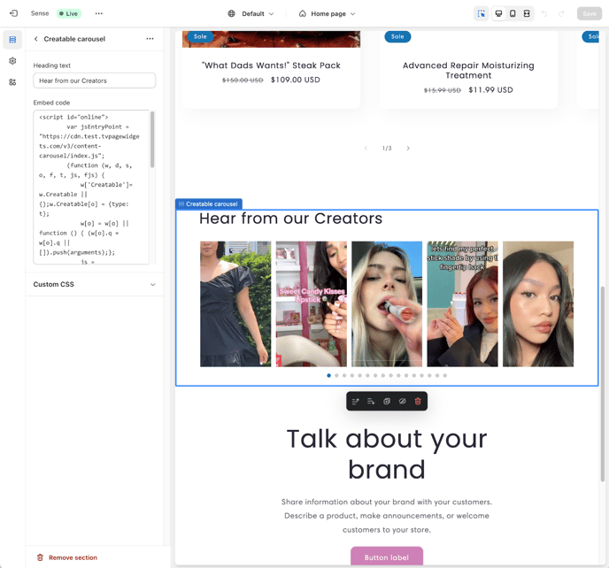 Once you have installed the Section code, we’ll add the new Section to your theme, starting with the homepage. Just like any other Section, click the + Add Section in the theme editor to add the “Creatable” Section to your homepage. Drag and drop the position of the Section (usually higher up the page is better, so customers have a better chance to see your awesome influencer content). Once you have the Section positioned, click on the Section, which will open it in the editor.