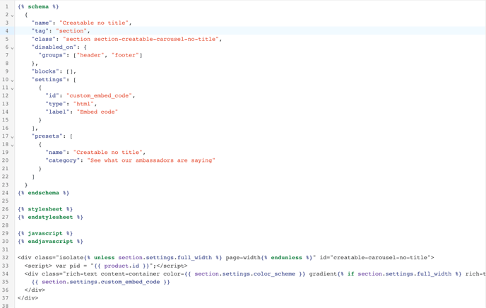 3. Paste in the embed code from the Creatable dashboard for your widget. Note: you will need to change the following part of the embed code in order to load content dynamically: