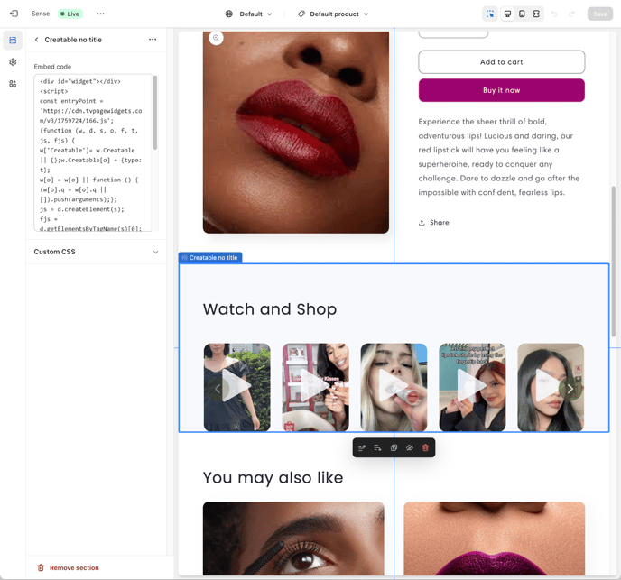 You can easily embed a widget of creator content in your product page template by inserting a new "Custom liquid" block and placing it in the area you wish.